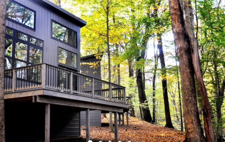 Our Rustic Frank Lloyd Wright inspired contemporary home is located on 10 wooded acres amidst nature's beauty. There are trails in the woods for hiking & cross country skiing. The floor to ceiling walls of glass in the apartment bring the outside in and the private deck provides additional spectacular views of the woods. When not enjoying the wonders of the outdoors, take advantage of our included streaming services. We have a brand new heating and cooling system with 24/7 service!
