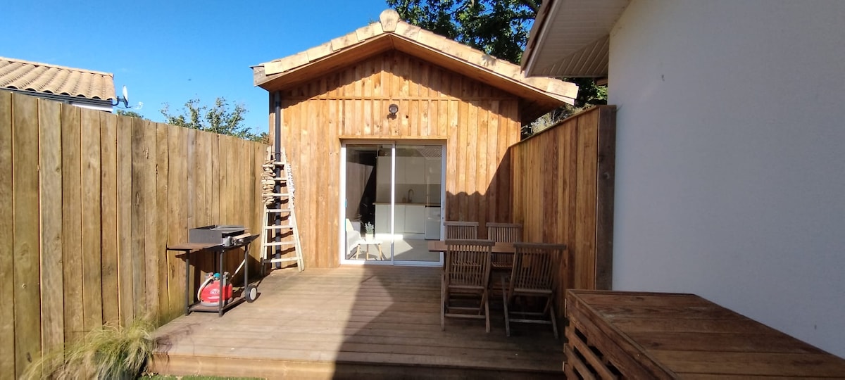 Pour un séjour reposant et authentique au coeur du bassin d'Arcachon, nous proposons de vous accueillir dans un studio indépendant neuf style cabane au fond du jardin de notre résidence principale. Belle terrasse exposée SO . Wi fi , télé avec connexion netflix gratuit. Clim réversible. Linge de lit et serviettes fournis ( lits faits). Nécessaire WE . Logement classé 3* Meublé de tourisme. Logement idéalement situé entre Arcachon et le cap Ferret pour une large découverte du bassin.