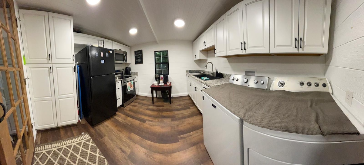 Затишний заміський будиночок із однією спальнею на спокійному кінному ранчо площею 65 акрів. Ідеально підходить для спокійного відпочинку. Усередині ви знайдете зручне ліжко queen-size, зону відпочинку, вітальню з розкладним диваном для додаткового спального місця та повністю обладнану кухню з газовою плитою з двома конфорками. Для сімей із дітьми можна взяти участь у програмі Pack'n play за запитом. На вулиці насолоджуйтеся огородженим заднім двором із ігровим пейзажем, зоною для барбекю, столом для пікніка. Захоплюючі заходи сонця та зоряні ночі. Ваш спокійний відпочинок чекає на вас!