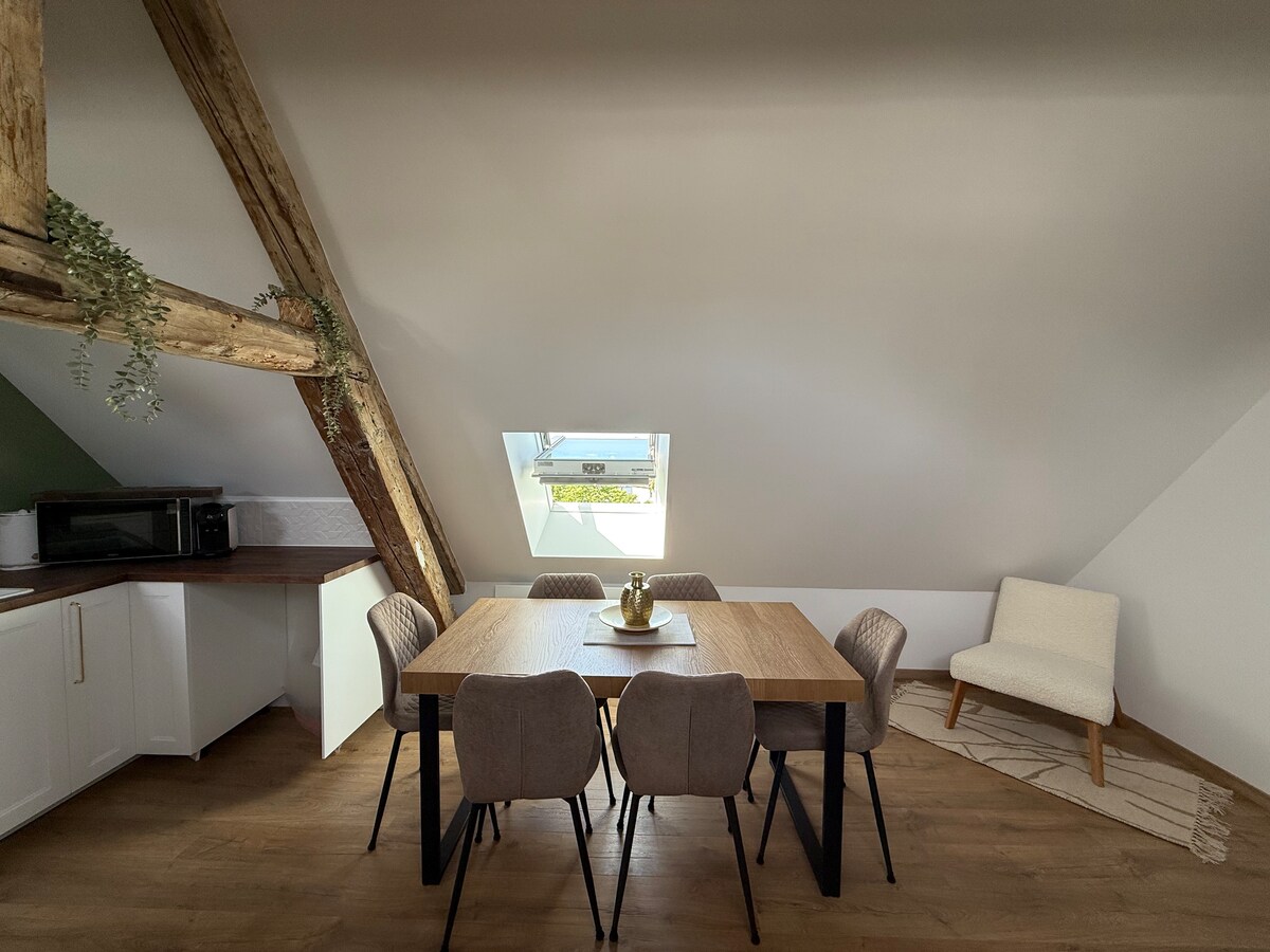 Велика квартира в «центрі міста», обідня кухня та світла вітальня з ліжком розміру «king size». Невелика тераса у внутрішньому дворі. Чарівність старого. Розташована в 2 кроках від маленької юрської Венеції, колегіальної церкви Дола, історичного району, ринку та дорожнього велосипеда, до командира можна дістатися пішки . Залізнична станція - 10 хвилин пішки . Резиденція захищена для зберігання велосипедів. Багато магазинів і ресторанів на вулиці, яка є тихою пішохідною, і безкоштовна парковка неподалік .