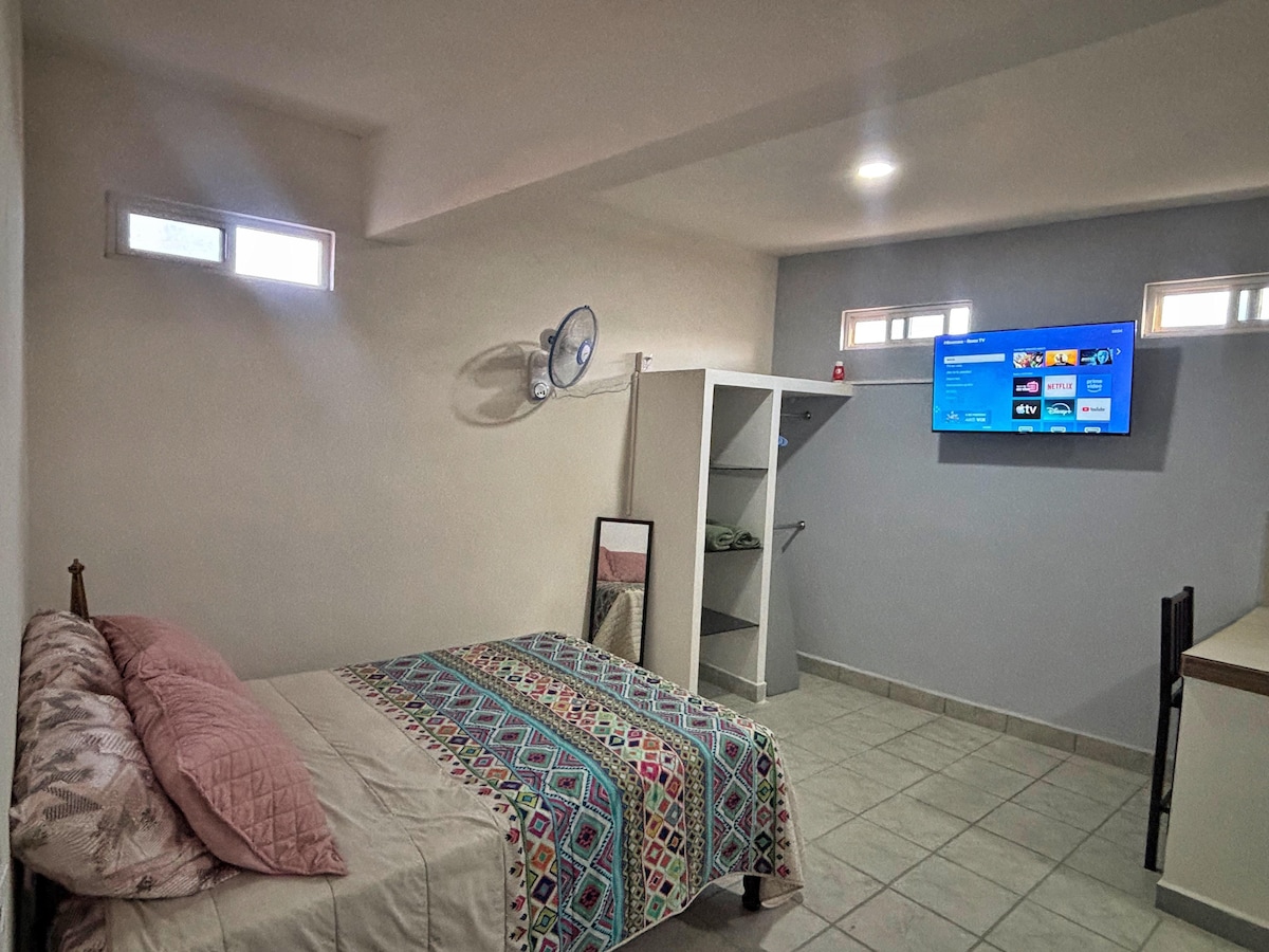 Cómodo departamento para una estadía agradable. Cuenta con buena iluminación y ventilación. Ubicado frente a unidad deportiva. Lugares cercanos; gimnasio, tiendas de abarrotes, centro de salud, farmacia, lavandería, puestos de comida y paraderos de camión. Entradas y salidas rápidas hacia las distintas carreteras. Cuenta con: Habitación con cama kingsize y A/C. Sofacama. Cocina con parrilla y frigobar (con enseres básicos para cocinar). Agua caliente por medio de calentador solar.