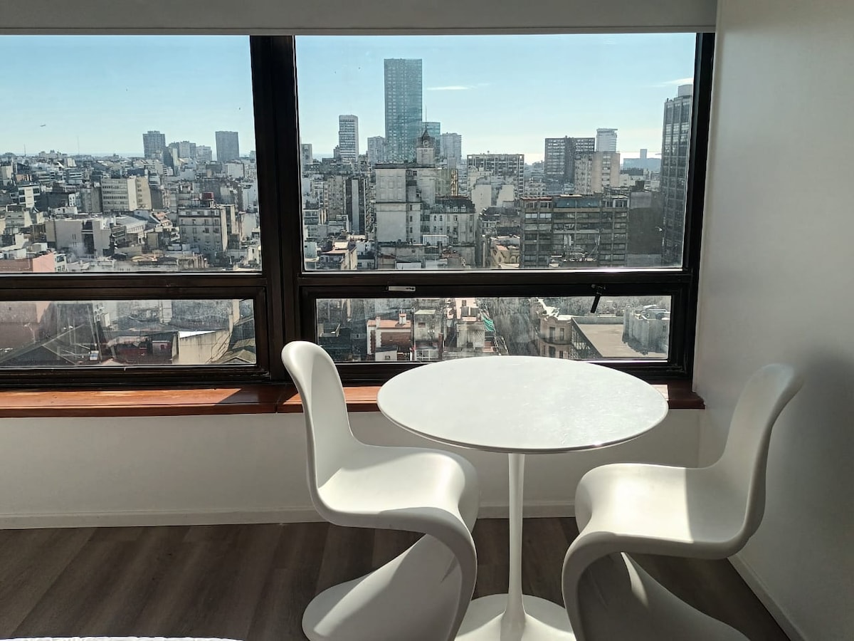 Bienvenidos a nuestro moderno estudio en el centro histórico de Buenos Aires, ubicado en el piso 14. Este espacio ofrece comodidad, seguridad y acceso a los principales puntos turísticos. Situado en una zona tranquila cerca de la Plaza de Mayo, con vistas espectaculares desde su balcón privado. Seguridad 24/7 y cerradura electrónica. Cocina completamente equipada. El edificio cuenta con piscina en la terraza, coworking, museo de sitio, cochera, laundry, auditorio, cafetería y restaurante.