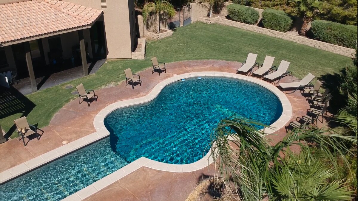 Великий сучасний будинок із приватним оазисом у пустелі - проведіть розслабляючі вихідні біля басейну або проведіть сімейну зустріч на великому красиво облаштованому задньому дворі. У цьому помешканні є все необхідне для шаффлборду, пінг-понг, більярдний стіл тощо. У цьому помешканні є гараж на 3 автомобілі, тому в ньому достатньо місця для паркування та зберігання іграшок у пустелі. Також є дуже довга під 'їзна доріжка вздовж правого боку помешкання для додаткового паркування. Можна з домашніми тваринами. Запитуйте про великі зустрічі.