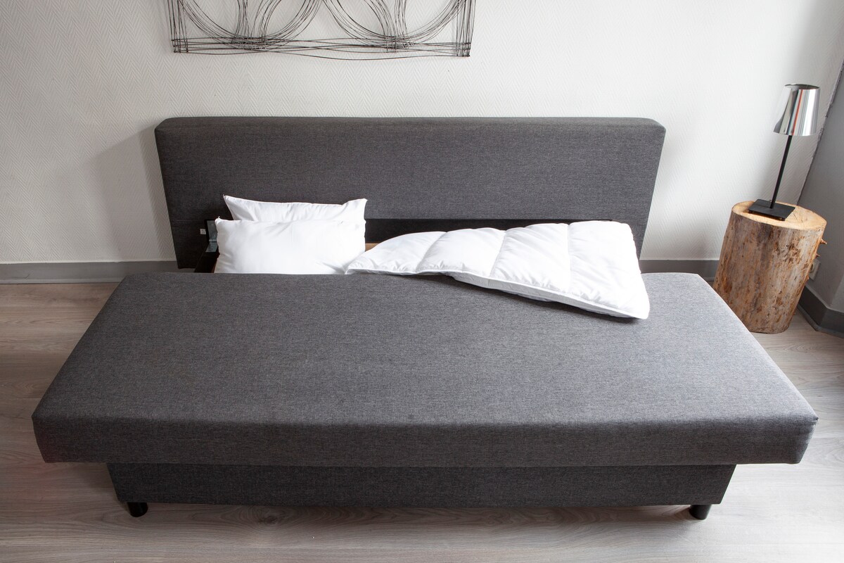 Велика студія зі спальнею, розділеною скляною перегородкою; в центрі міста, в невеликому тихому тупику, в 5 хвилинах ходьби від торгового району і в 10 хвилинах від замку. Багато чарівності для цього пір 'я ідеально підходить для туристів, альпіністів та любителів природи, які бажають відкрити для себе лісовий масив Фонтенбло. Ця квартира має всі зручності: невелику ванну кімнату з душем та туалетом, функціональну міні-кухню, вітальню та спальню.