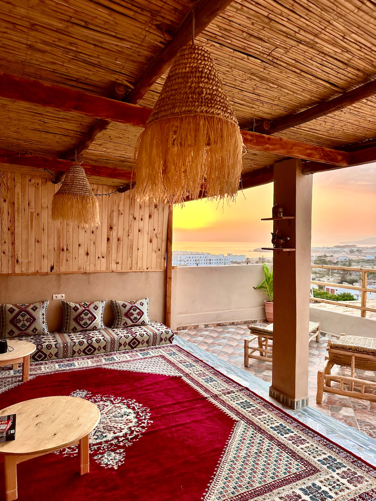 Спокійна дерев’яна квартира на даху з видом на море та власною терасою Tafoukt Bay – це затишна дерев’яна квартира на даху тихого будинку в Тамраті, лише за 7 хвилин ходьби від пляжу Банана. Насолоджуйтеся сонячною терасою з фруктовими деревами та травами, панорамним видом на море, високошвидкісним Wi-Fi, повністю обладнаною кухнею та пральною машиною — ідеально підходить для йоги, кави та заходу сонця.
