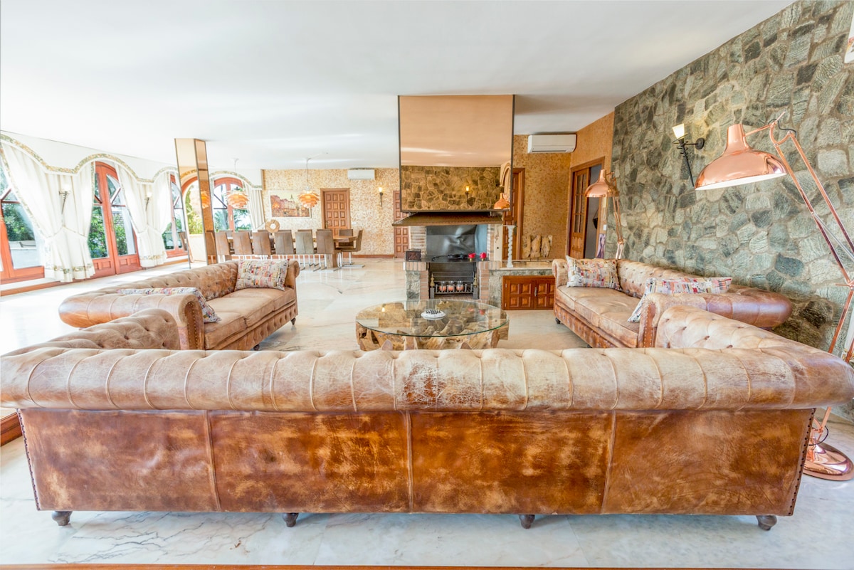 Вас зустрінуть Драконівські ворота Гауді. Будинок побудований у стилі замку з мармуровою підлогою та факелами - величезний млинчик як місце для зближення під час їжі. Чудовий вид на море з саду та терас. Багато місця в приміщенні (750 м2) і на відкритому повітрі, а також великий басейн із солоною водою для відпочинку. Насолоджуйтеся великим піщаним пляжем, ресторанами, величезним торговим центром і дикою природою - до всіх можна дістатися пішки протягом 10 хвилин. Біле селище Міхас знаходиться всього за 10 км.