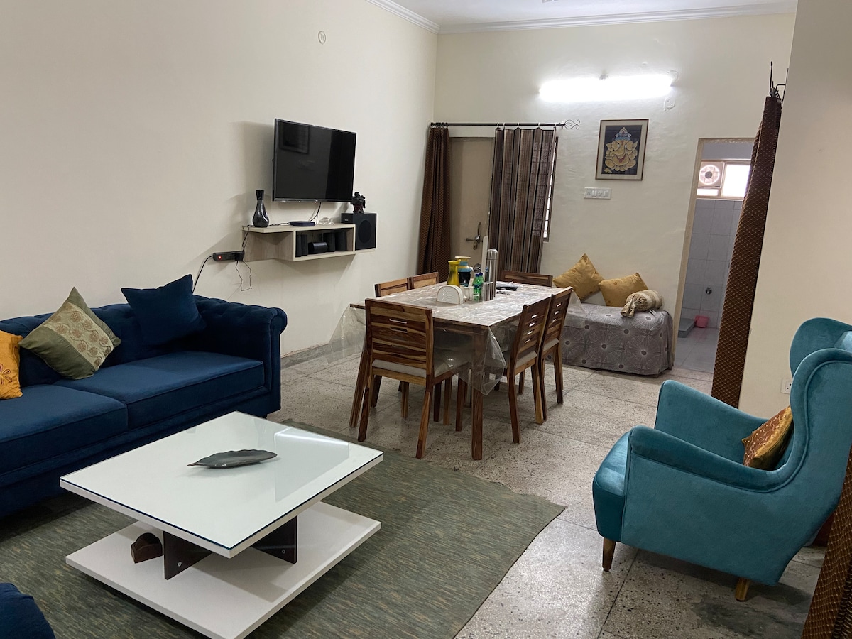 Окреме помешкання для сімей або групи друзів від 4 до 5 осіб, а також для пар. IMP: бронюйте відповідно до ваших потреб за розумною ціною. CL/ Wap 9I3I-nine9-2o76, щоб дізнатися більше Цілодобове резервне живлення та мебльована кухня, RO, холодильник, пральна машина, телевізор, 2 спальні та 2 ванні кімнати. Також доступний охолоджувач води (якщо не кондиціонер). Забронюйте і насолоджуйтеся відпочинком як вдома. Місцеві послуги перевезення, такі як Auto/Ola, а також послуги доставки їжі Zomato та Blinkit доступні в будь-який час.
