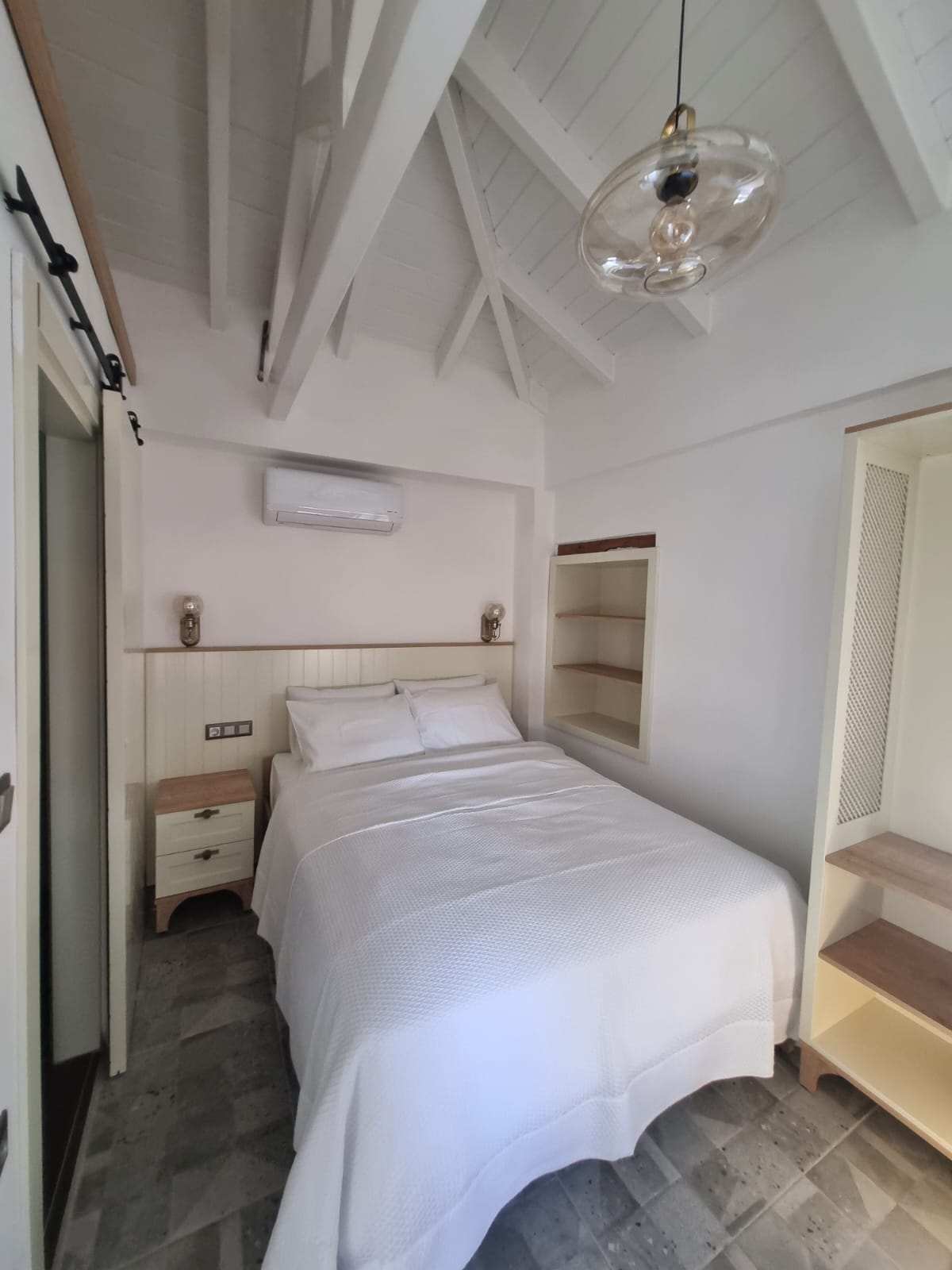 This unique place has a style all its own with a great view of blue & green in the center of Kayalar village, located 5 min drive to spectacular Aegean beaches and restaurants, 15 min drive to Küçükkuyu and Assos. Ground floor offers living room, kitchen, bathroom and a bedroom with two beds. You can also enjoy the fireplace. First floor offers the master bedroom with a full view balcony and a private bathroom. Kitchen offers all the necessary equipments. Entire villa has floor heating system.