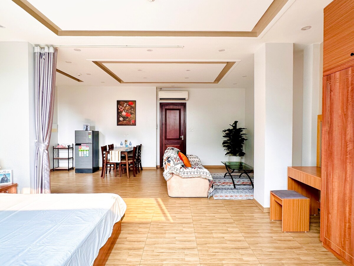 Гарна та простора студія з обслуговуванням Будинок охорони 24/24 консьєрж. Ліфт на дерев 'яній підлозі Гаряча вода Кондиціонер King Size 1,8 x2 м Безкоштовний Wi-Fi Кухня Tivi Холодильник Мікрохвильова піч Безкоштовна кава та чай Поділіться пральною машиною та сушильною машиною Парковка мотоциклів Студія розташована на 3-му поверсі будівлі, поруч із Західним озером, озером Трук-Бах; 20 хвилин ходьби до Старих кварталів. Гнучкий час прибуття. Реєстратор реєстрації в робочий час. Послуги прибирання 3 рази на тиждень. Багато супермаркетів, ресторанів, кафе, спа-салонів.