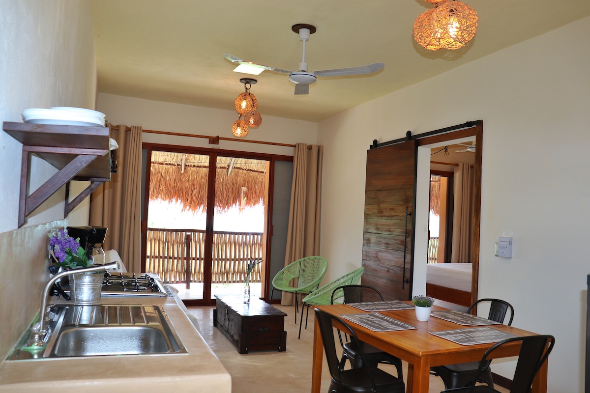 Nuestra Suite Ek (Estrella en maya) es un espacio diseñado para hasta 4 personas. Cuenta con una recamara privada cama Queen size y un sofacama matrimonial y una recamara con opción de cama King size o 2 inviduales, además dispone de sofácama y una cocineta equipada con comedor y donde está el área común. Ideal para parejas que viajan con sus hijos, familias pequeñas o grupos de amigos en una aventura en el Caribe.
