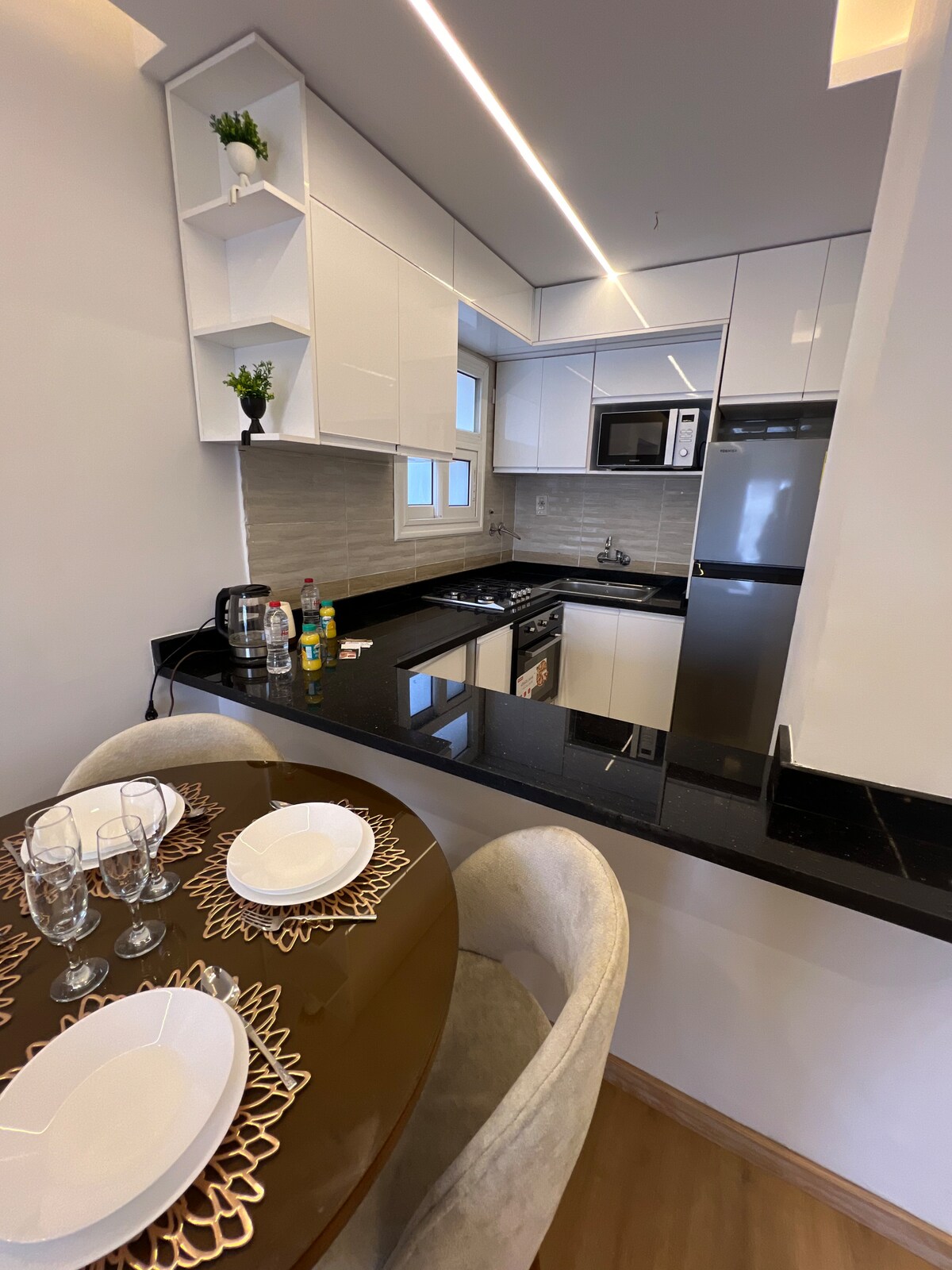 така модна студія, недалеко від усього, ексклюзивна приватна зона, розкішне оздоблення, тиха, абсолютно нова, елегантна, затишна, особлива, щоб провести незабутнє перебування, негайні відповіді від господаря, обладнані усім необхідним, не забуваючи жодних деталей, які змусять вас відчути себе як удома.