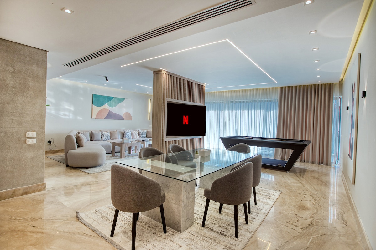 Ця простора квартира повністю мебльована і обладнана усім необхідним для комфортного перебування. Розслабтеся та перегляньте улюблені фільми та телевізійні шоу на звуковій системі з доступом до Netflix, beIN Sports, Shahid, Watch та Starzplay. Розташована в центрі міста, недалеко від всіх основних пам 'яток. Усього в декількох хвилинах ходьби від автовокзалу , магазинів і ресторанів. Незалежно від того, подорожуєте ви у справах або для задоволення, ця сучасна стильна квартира - ідеальне місце для розміщення.