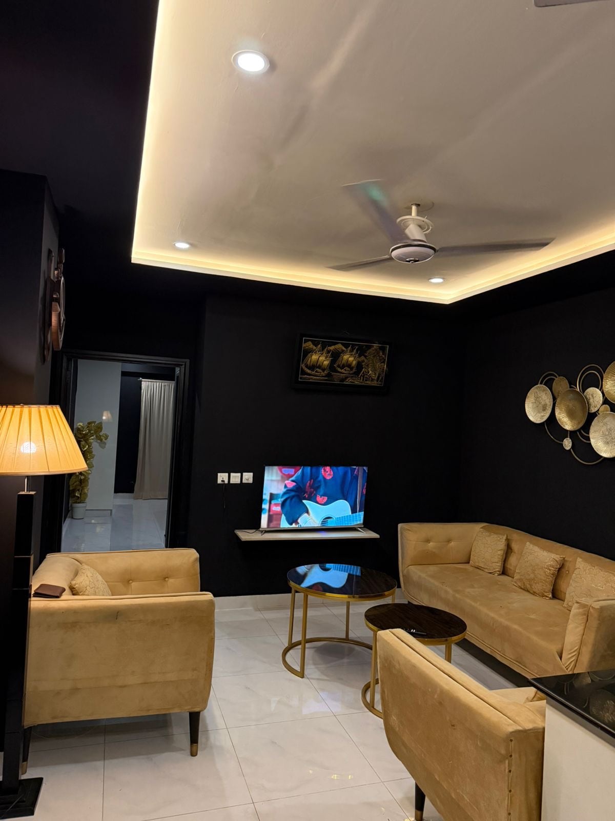 Чиста та комфортна розкішна квартира з 1 ліжком на 4-му поверсі з дивовижним видом. Розташування в центрі Лахора, ідеально підходить для сімей, які відвідують Лахор. Ця ціна включає всі зручності, такі як басейн, тренажерний зал, кінотеатр, генератор/резервне живлення 24/7, охорона, ліфти та стоянка на цокольному поверсі. - Високошвидкісний Інтернет і 32-дюймовий інтелектуальний СВІТЛОДІОД для Android - 1 ліжко King size. - Додатковий матрац для дітей. - Диван у формі L для розміщення до 7 осіб. - Повністю обладнаний кухонний простір. - Чиста та сучасна ванна кімната.