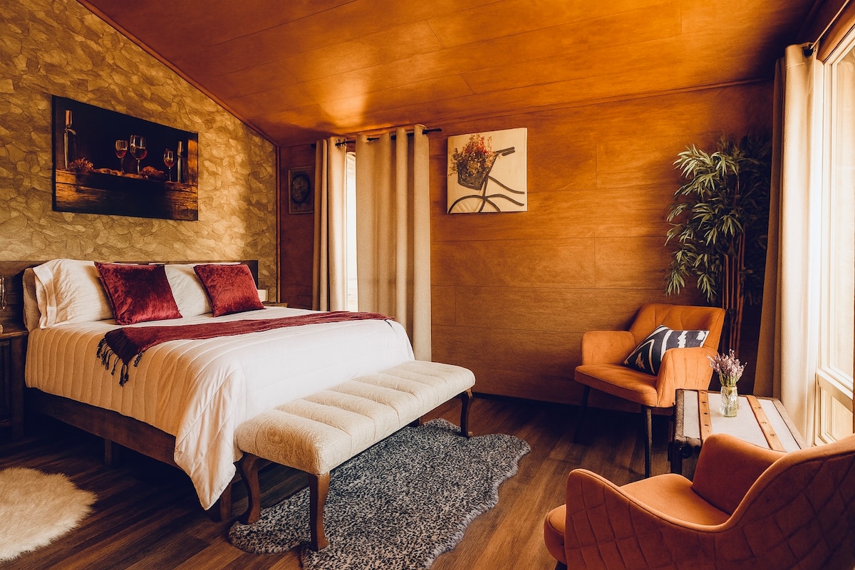 Кімната призначена для приємного відпочинку та насолоди сходами, заходами сонця, небом, зірками та місяцем з вашої тераси. Підходить для двох осіб, з ліжком queen-size, кондиціонером, вентилятором, кавоваркою, гарячою водою та високошвидкісним супутниковим Інтернетом. Стіна по периметру для конфіденційності та безпеки. У ванній кімнаті є дзеркало, мило, шампунь, кондиціонер, рушник для рук та фен. Насолоджуйтеся виноградниками та виноробнями у Валле-де-Гвадалупе. Безпечний і близький до найвідоміших місць регіону.