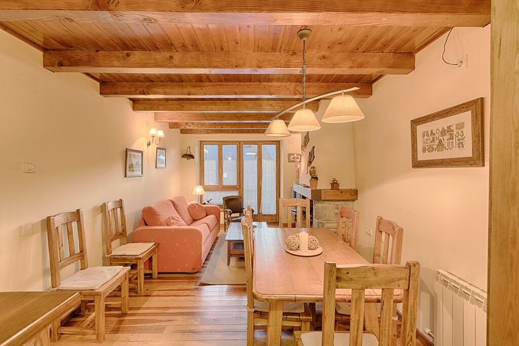 Apartamento Dúplex (Dreta) WIFI gratis. Dos habitaciones (5 pax máximo), baño completo, sala de estar con cocina americana completamente equipada. Sábanas, nórdicos y toallas incluidas. VISTAS ESPECTACULARES. Todos los apartamentos en que está dividida la casa, tienen acceso libre a la Terraza-Mirador privada del alojamiento. Aparca delante de casa. A 3km de Vielha y a 15km de Baqueira. Disponemos de dos apartamentos muy parecidos (Dreta i Esquerra), entre los dos tienen capacidad para 10 pax.