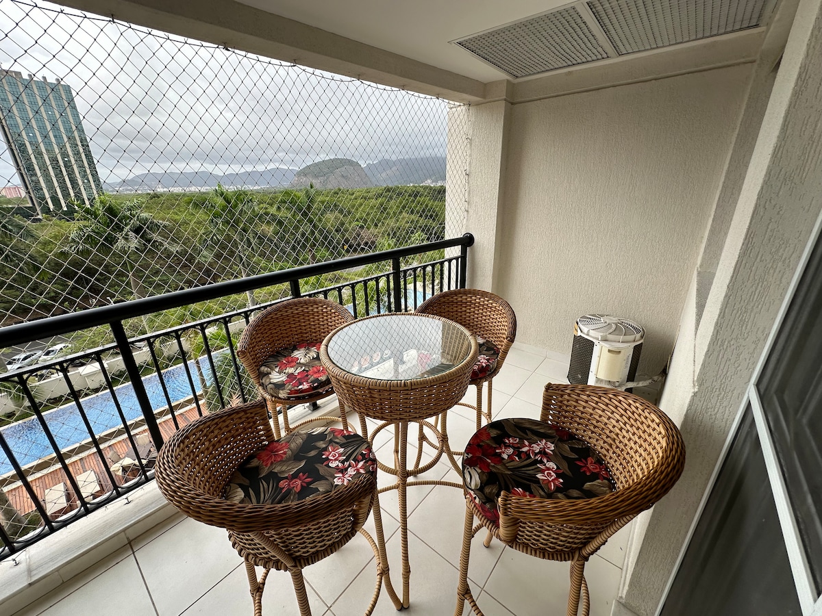 Розташований в одному з найбезпечніших кондомініумів у Ріо-де-Жанейро, насолоджуйтеся комфортом і зручністю. Кондомініум із тенісним кортом, футбольним клубом, стежкою, парками та дитячими атракціонами. Усередині кондомініуму ви також можете насолодитися торговим центром з гастрономією та супермаркетом. У квартирі є посудомийна машина, пральна машина, мікрохвильова піч, телевізор тощо. У будівлі є басейн, сауна, джакузі, ігрова бібліотека, фітнес-центр тощо. Під час вашого перебування доступні послуги з прибирання. *PS5 в квартирі!*