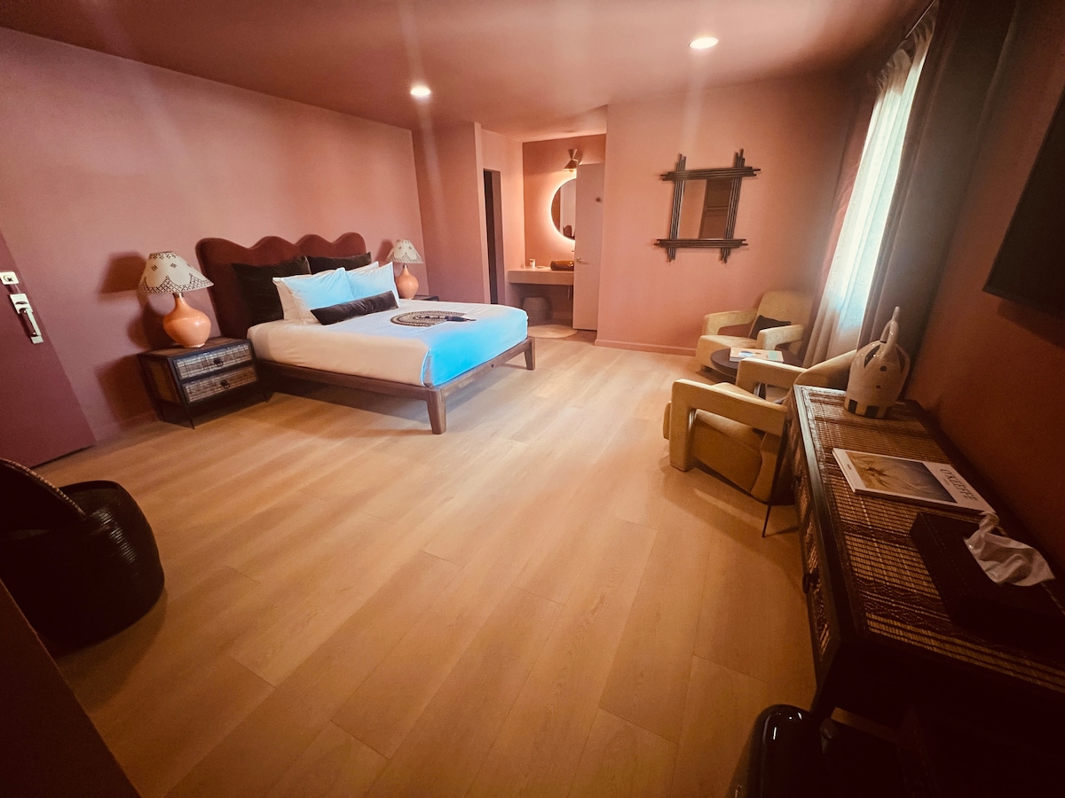 Кімната 2 – це затишне помешкання площею 140 кв. футів / 13 кв. м із ліжком розміру queen-size, ковдрами та наволочками, виготовленими на замовлення, та оригінальними творами мистецтва. Він також включає письмовий стіл і вид на вивіску готелю, безкоштовний Wi-Fi, смарт-телевізор, закуски, шафу та ванну кімнату з душем, а також нашу фірмову підлогу з 29 плиток. Дизайнерський мотель поблизу Джошуа-Трі. Прокиньтеся під проміннями сонця, насолоджуйтеся найкращими походами, а потім завершіть вечір смачною їжею та коктейлями в Kitchens Dessert.