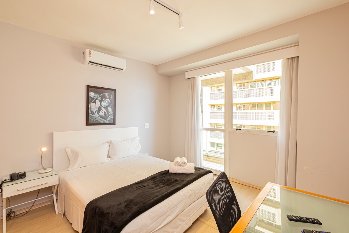 Повна студія в закритому кондомініумі з чудовою структурою та розташуванням у безпечному районі поблизу Альфавіля. У студії є швидкий Інтернет, Android-телевізор, кухня, ліжко queen-size, міні-бар, постільна білизна, рушники, фен, побутові засоби та паркувальне місце. У кондомініумі є цілодобова пральня, міні-маркет, басейн, тренажерний зал і стійка реєстрації цілодобово. Поруч ресторани, пекарня, гамбургер, піцерія, бари, аптека, ринок - все дуже близько без автомобіля.