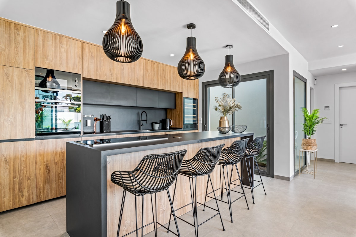 Гольф, пляж, бари, ресторани, велике місто або тихий відпочинок. Візьміть із собою сім 'ю або друзів і насолоджуйтеся цим елегантним помешканням. Абсолютно нова розкішна вілла має низку зручностей. Приватний сад і зона басейну з різними зонами відпочинку, шезлонгами та барбекю, що ідеально підходить для відпочинку на свіжому повітрі. Ви можете поринути на три поверхи з великою терасою на даху, де можна насолоджуватися видом на місто і море. Кондиціонер і швидкий Інтернет. Ми пропонуємо 3 двоспальні ліжка 160*200 і 4 односпальні ліжка 90*200.