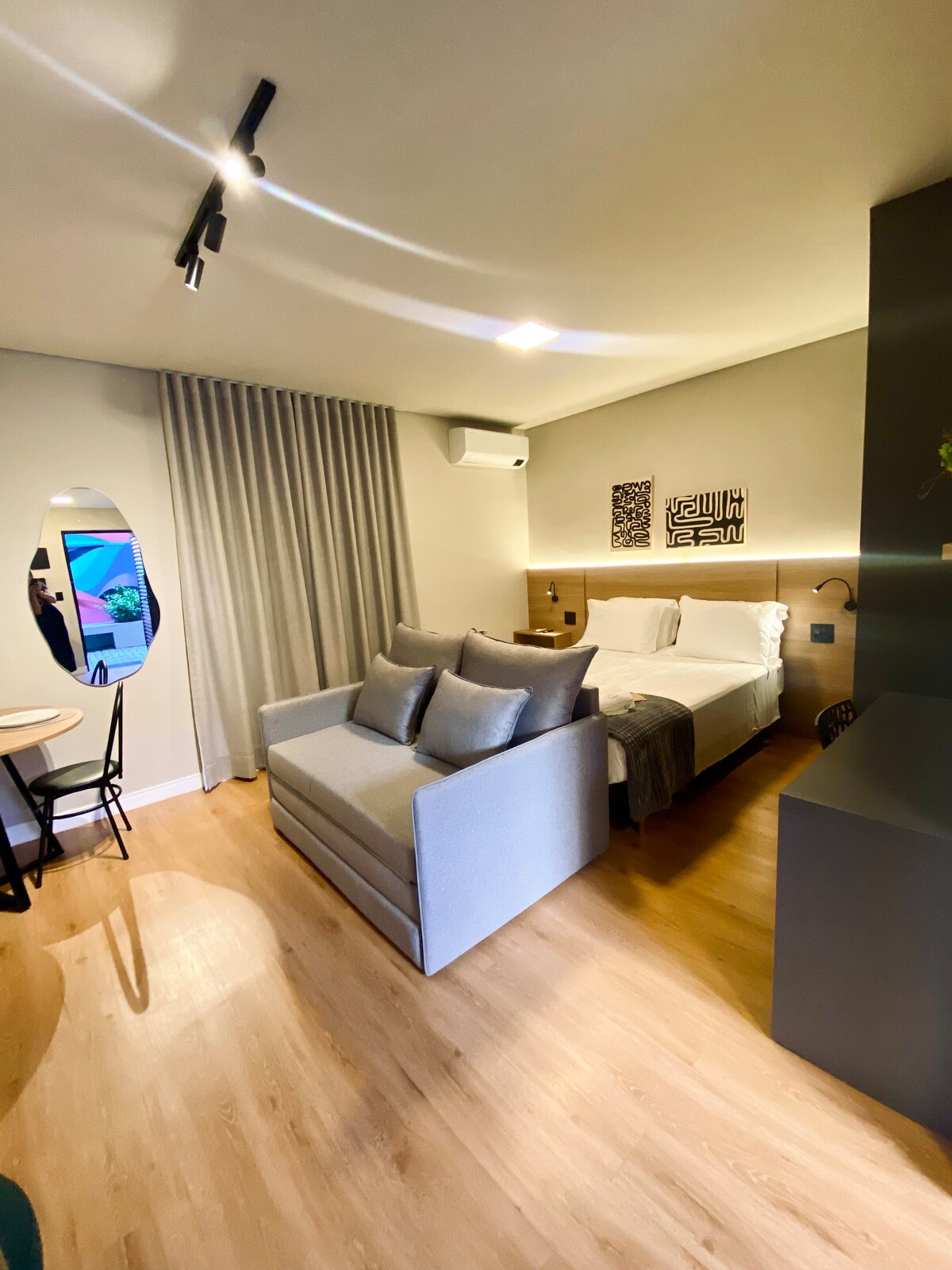 ЛОФТ був спроектований у кожній деталі для комфортного та стильного перебування, де є все, що вам може знадобитися під час перебування. Одне з найпривілейованіших місць у місті, недалеко від усього, з гігантським вікном і видом з Praça da Paz, де ми знаходимося: 500 м до магазинів Bauru (6 хвилин пішки); 600 м від USP | Centrinho | Vitória Régia Park | McDonald's | BK (8 хвилин пішки); У нас є каталог рекомендацій, і якщо вам потрібен персоналізований консьєрж (безкоштовно) для закладів.