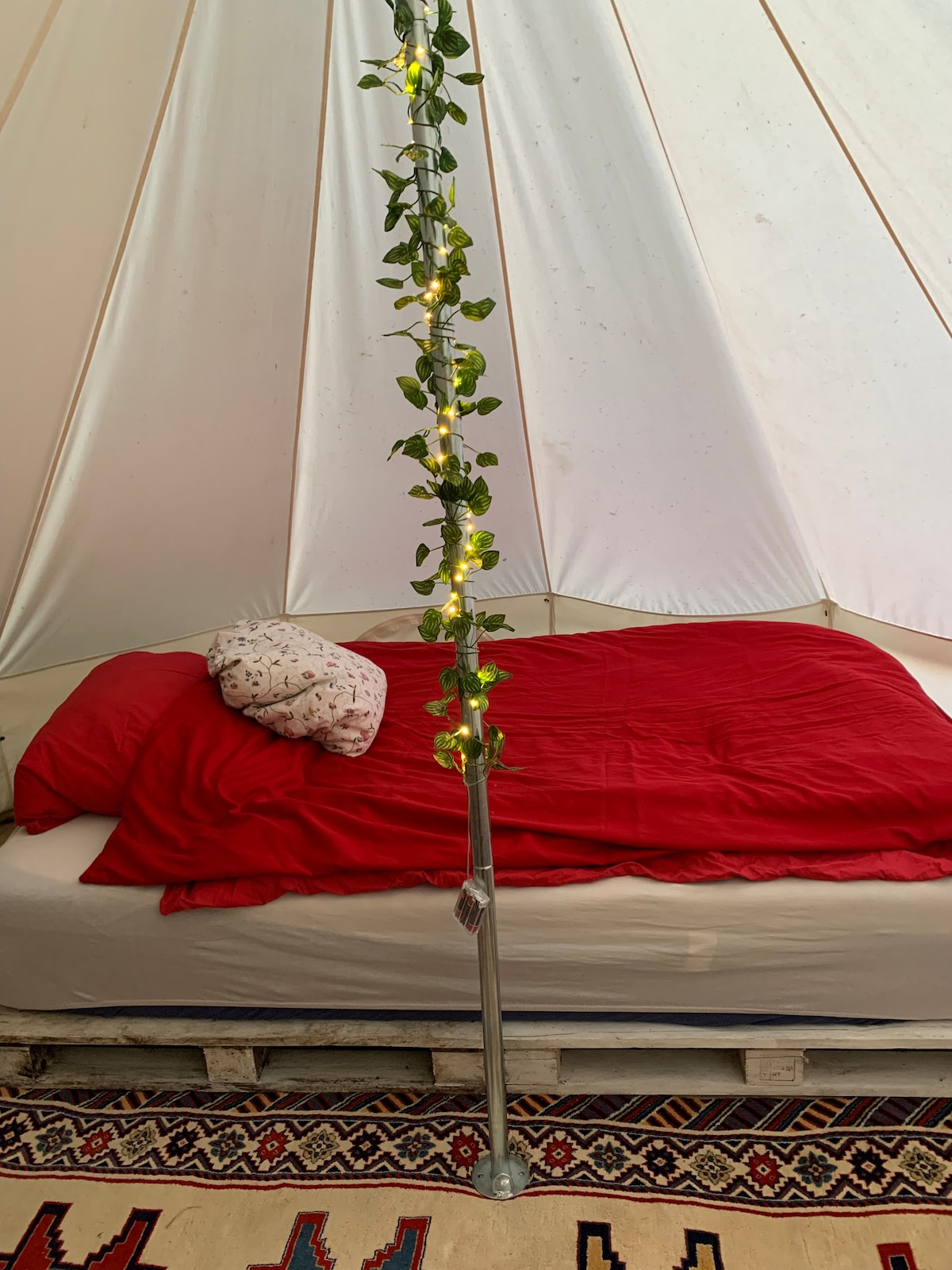 Наш бавовняний намет пропонує зручне ліжко 1,40м з особливо зручним матрацом. Тут ви можете чудово відпочивати та проводити розслабляючі ночі після насиченого подіями дня на природі. Вона оточена мальовничим фоном для дерев і чагарників. Насолоджуйтеся повним усамітненням і зачаровуйте заспокійливу тишу природи. Подихайте свіжим повітрям, залиште повсякденний стрес позаду.