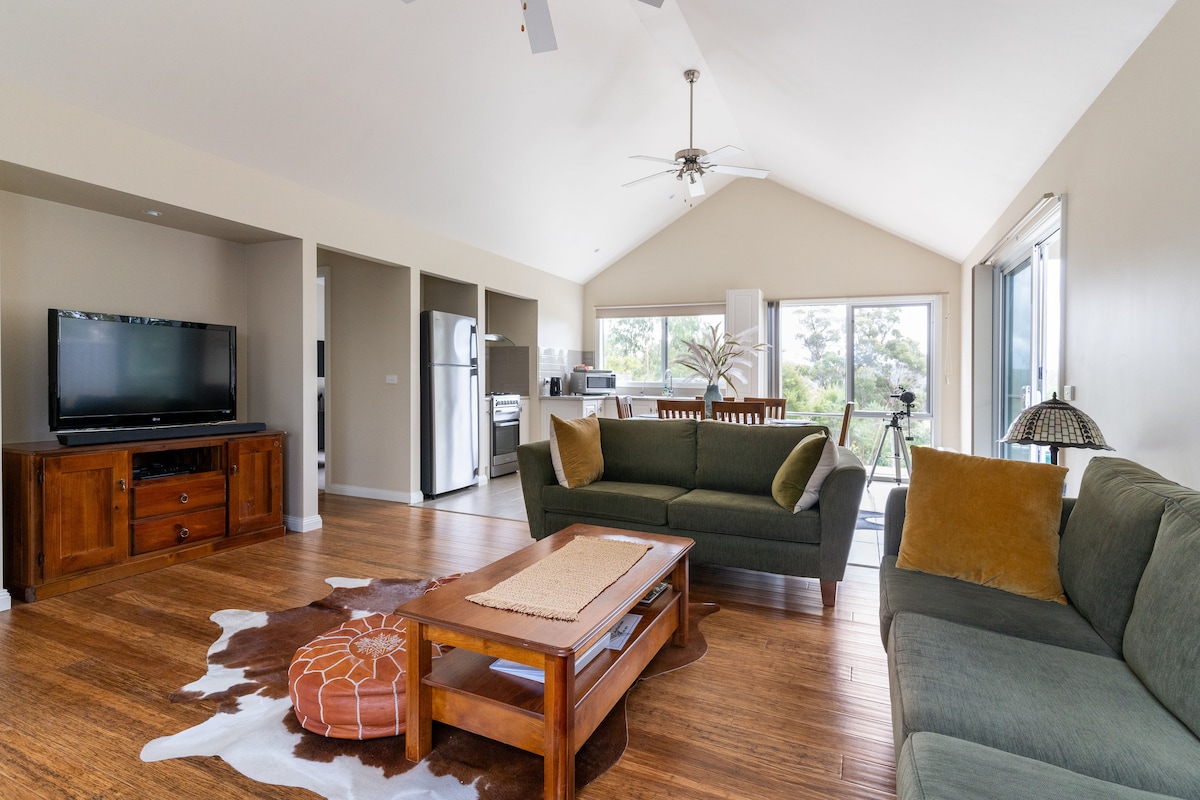 A stylish & private apartment, over the ground floor level of a two story house, on an acre of land with majestic mountain views awaits you in East Warburton. We are not always in residence, however if we are we do our utmost to ensure privacy & a peaceful stay for our guests. We are situated minutes from the Redwood Forest and Bodhivana Monastery with an 8 minute drive to Warburton township. An array of culinary experiences, walks, wineries, waterfalls and more will all be yours to discover