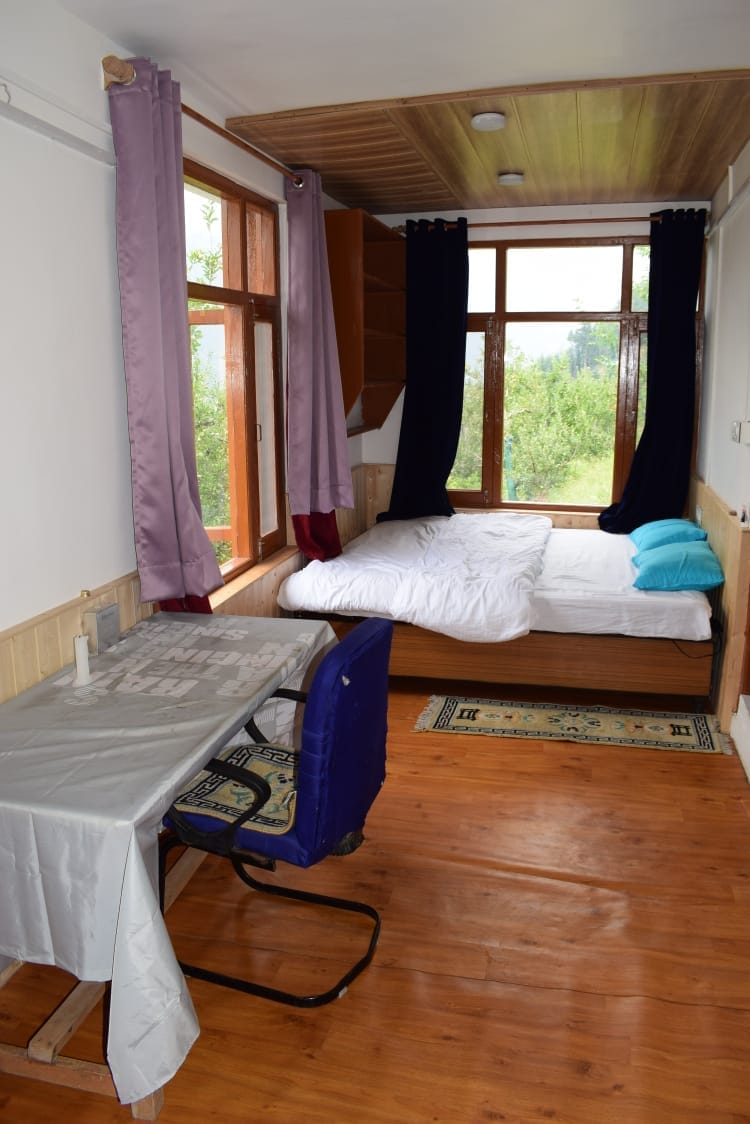 A beautiful eco friendly and artistic cabin cottage with attic located in the Manali Beas valley, surrounded by lush apple gardens and mountain ranges. The Cabin has a fully functional kitchen, heater and geyser. We do NOT serve food. The cabin is decorated with upcycled, sustainable and eco friendly products. We also have a unique toilet. The place is located about 5 km from Old Manali and New Manali (Mall Road). We have full road access to our doorstep.