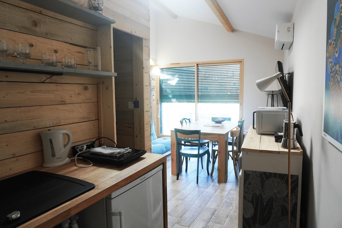 Невеликий відремонтований окремий будинок на 2 поверхах у тихому саду з окремою вітальнею на першому поверсі та спальнею на верхньому поверсі з відкритою ванною кімнатою та окремим туалетом. Безкоштовний сніданок подається в номері або на терасі. Приватна парковка на території помешкання. Швидкий доступ НА трамваї до Ліона-Сент-Пол. Соляний басейн 2,5 х 9 м у сезон (з 1 червня по 30 вересня). З 'їзд з автомагістралі A6 менш ніж за 5 хвилин. Ми можемо запропонувати підноси для їжі за додаткову плату в номері або на терасі