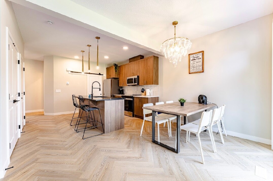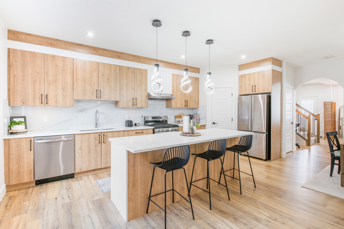 Відпочиньте стильно в цьому сучасному показовому помешканні з 3 спальнями в Едмонтоні, район Бомонт-Ле-Рев. Ідеально підходить для сімей або груп, вміщує 9 осіб і має кондиціонер, приватний задній двір, кухню для гурманів і додаткове робоче місце. Всього за 20 хвилин від аеропорту YEG, з подвійним гаражем і зручностями для сімей. Головна спальня має гардеробну та ванну кімнату з ліжком розміру King size. Дві додаткові спальні мають двоспальне ліжко та два односпальні ліжка. Друга ванна кімната, пральня на другому поверсі та додаткова кімната.