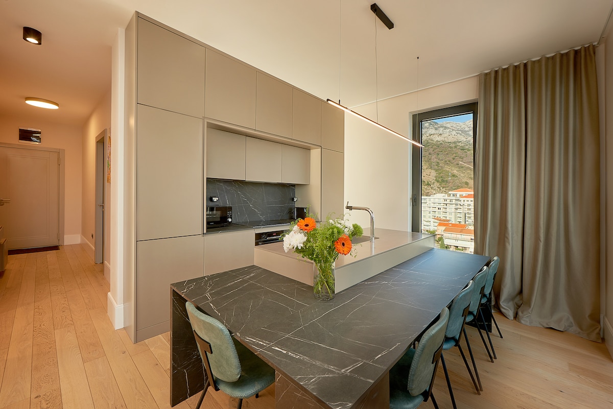 Пропонується нова стильна квартира з видом на море, оригінальним плануванням та комфортним дизайнерським рішенням. У розпорядженні гостей - окрема спальня, велика вітальня з обладнаною кухнею та барною стойкою. В обох кімнатах smartTV, опалення та кондиціонери. З усіх вікон відкривається вид на море, а тераса заворожує видом на острів - одну з головних визначних пам'яток Будви. Квартира розташована в 5 хвилинах їзди до пляжу та Старого міста Будви. І в 17 км до аеропорту Тіват.