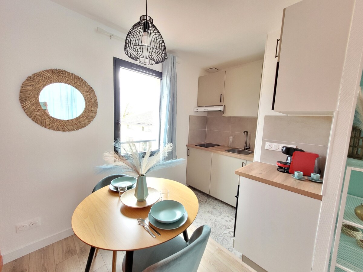 Нова та світла квартира T2 з сучасним та акуратним декором, ідеально підходить для 4 осіб. Вона розташована в 12 хвилинах їзди на трамваї від історичного центру Бордо. Насолодіться затишною спальнею, зручним диваном-ліжком та ванною кімнатою з душовою кабіною та пральнею. Відкрита кухня повністю укомплектована. Тут є сонячна тераса для відпочинку та місце для паркування. Доступ до високошвидкісного Wi-Fi та смарт-телевізора з доступом до Netflix включено.