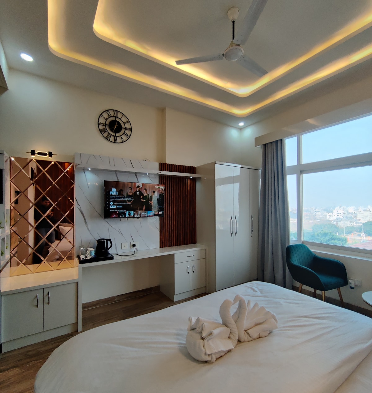 Kick back & relax in this calm & luxurious studio with the warmth of home & the vibe of a high-end hotel. Furnished with a plush King-size bed & modern décor. Amenities: 24/7 Grocery Store Modern Kitchenette High-Speed WiFi & TV Secure Parking outside tower but 24/7 Secured The first 2 floors has commercial shops, offering: Laundry Services Salon Café Medical Store Easy access to the India Expo Mart, Buddh International Circuit. Perfect for couples, solo travellers, or business partners.