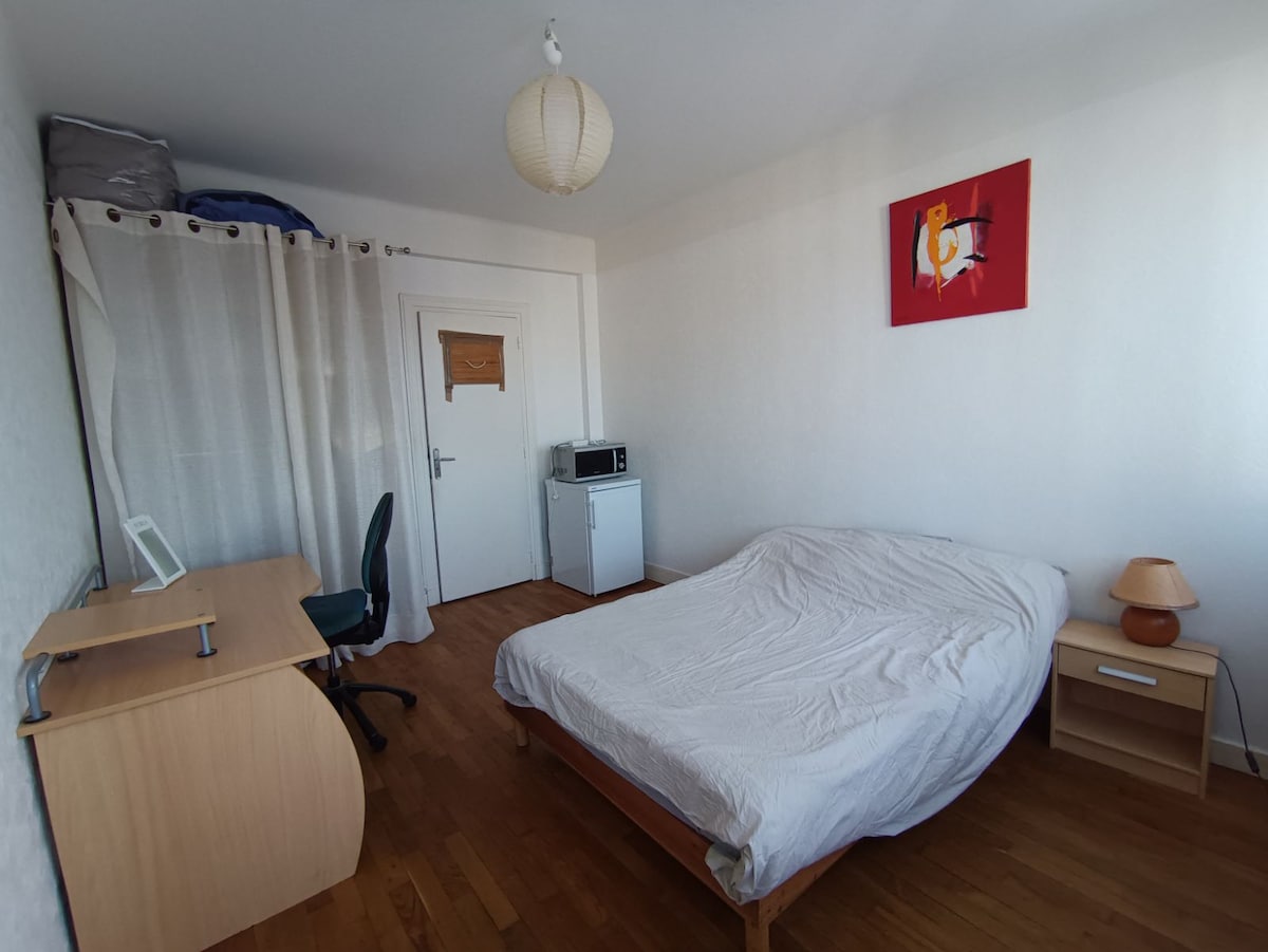 Я пропоную вам простору кімнату площею 14 м² (з ліжком 160*200, телевізором і безкоштовним Wi-Fi) на першому поверсі мого помешкання. Цей рівень буде зарезервовано для вас. У вас буде власна ванна кімната з подвійною раковиною та туалетом. За бажанням ви також можете скористатися закритим паркінгом. Сніданки подаються у вітальні або на терасі, якщо дозволяє погода. У вартість входить туристичний збір і сніданок для 2 осіб .