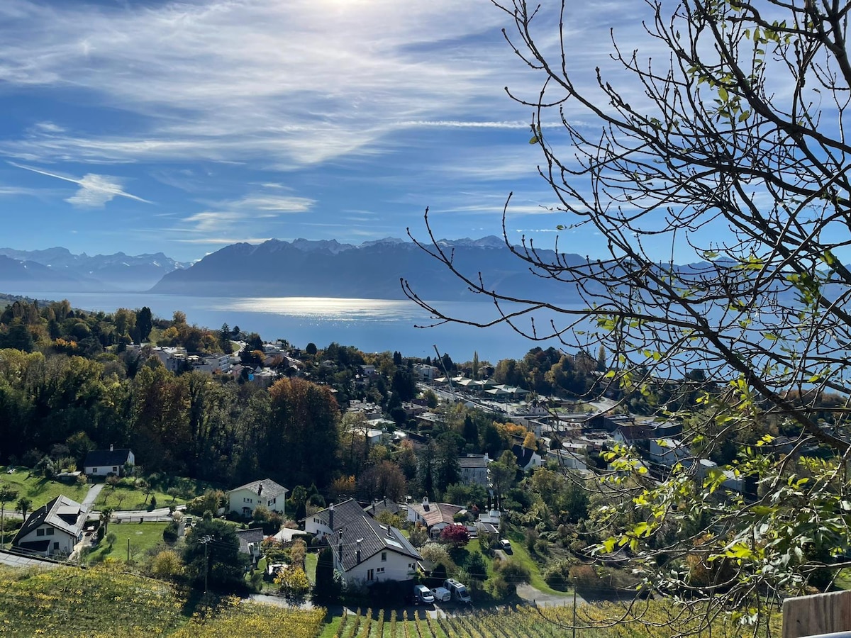 Un lieu privilégié avec vue 180 degrés sur les vignes, lac et montagne Appartement neuf, grande terrasse surplombant le lac, Beaucoup de cachet, vieux bois, pierres naturelles, douche italienne, sèche cheveux, cuisinette, avec évier, frigo, bouilloire, thé, café, micro-ondes, four, 1 plaque électrique, deux casseroles , assiettes etc... Coffre-fort, TV led etc... Mini bar, vins de la région ! Transports publics (train) gratuit de Lausanne à Montreux ! Parc privé et gratuit devant la maison!