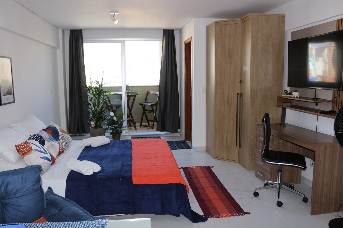 Ця квартира нещодавно відремонтована, сучасна, красива та затишна. У люксі є 42-дюймовий смарт-телевізор, двоспальне ліжко king-size, кондиціонер для ковзання та шафа. У вітальні є телевізор, Wi-Fi, диван-ліжко та гранітний стіл для роботи та харчування з американською кухнею, обладнаною різним посудом, плитою, мікрохвильовою піччю та міні-баром. З квартири відкривається вид на торговий центр Pátio Savassi та торговий центр Serra do Curral. Він розташований в центрі Савассі, де є хороші ресторани, аптека та транспорт.