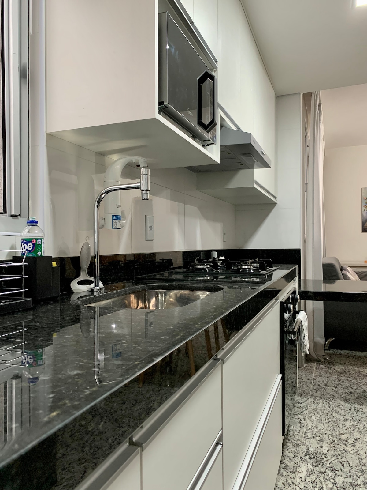 Нова квартира, добре провітрювана, добре обладнана, критий паркувальний майданчик, з ліфтом! Розташований у закритому кварталі Praça da Savassi, недалеко від центру міста, біля торгового центру Pátio Savassi та інших магазинів. Нещодавно він був обладнаний для прийому розважливих і смачних клієнтів! 120 МГ Wi-Fi. Невелика квартира з вітальнею, міні-кухнею та сюїтою з шафою.