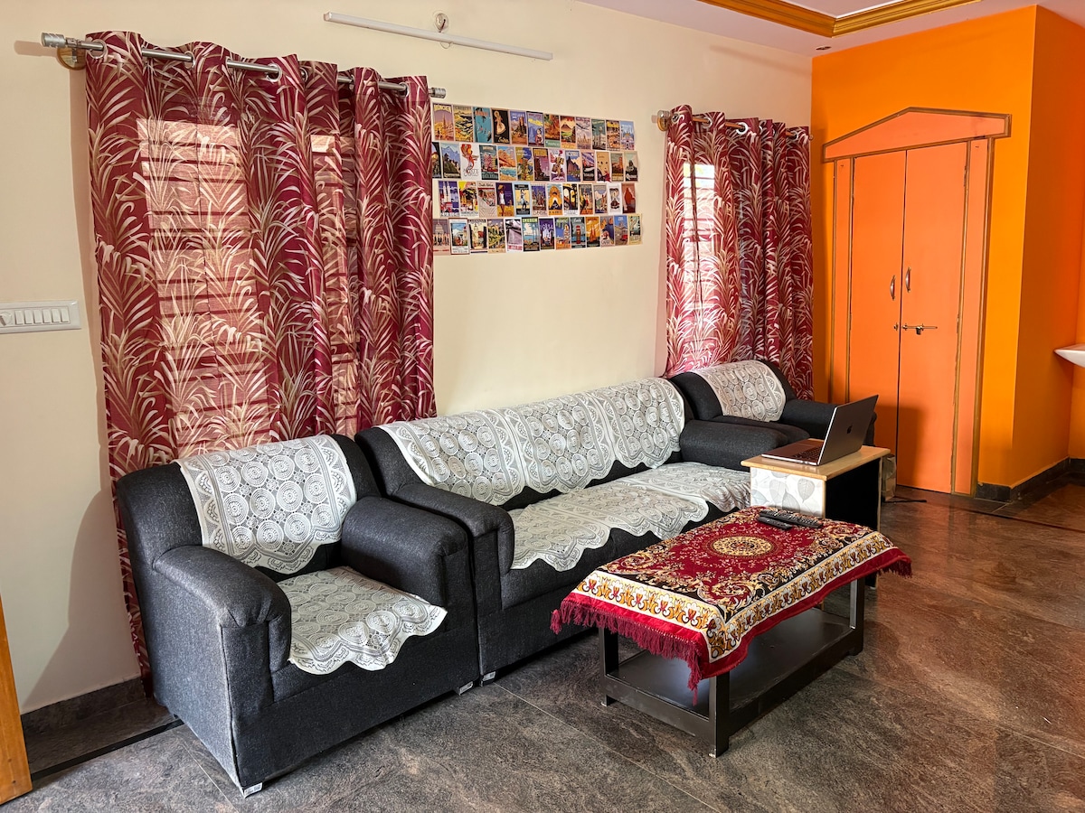 Наш затишний і комфортабельний 2 BHK на 2-му поверсі повністю мебльований і обладнаний усіма сучасними зручностями, включаючи кондиціонер у головній спальні, телевізор, холодильник, мікрохвильову піч, газову плиту, інвертор, гейзер тощо, у спокійній обстановці, яка знаходиться в 1,5 км від кола Баннергатта. Сніданок безкоштовний. Вечеря за необхідності надається з завчасним повідомленням за додаткову плату. Можлива автентична мангалорейська їжа.