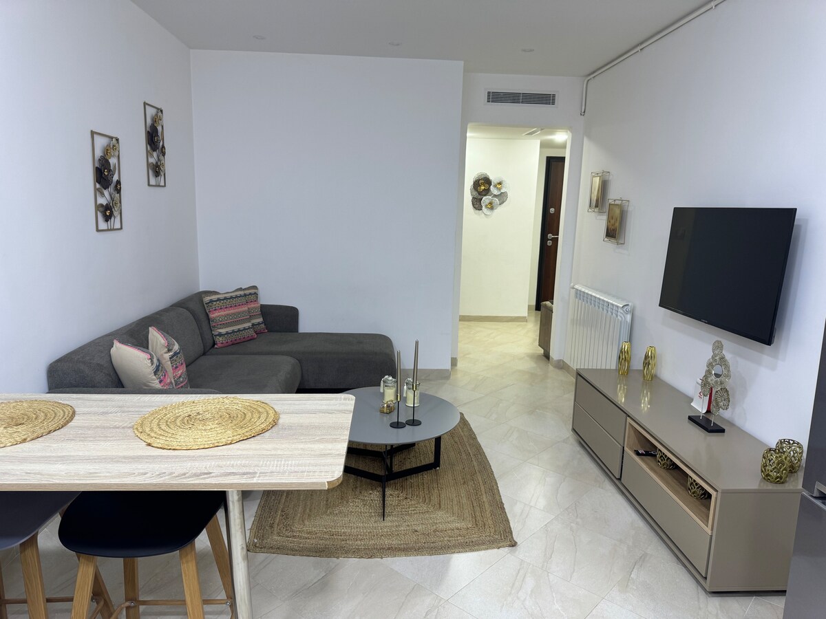 F3 площею 66 м2 - весь комфорт, тихий і яскравий, повністю відремонтований з дерев 'яною паркетною підлогою. Нетипове та ремісниче оформлення. Складається з: • Вітальня з повноцінною кухнею • Вітальня (кутовий диван із телевізором) • 2 спальні (двоспальне та багатоповерхове ліжко, розкладне ліжко та парасолькове ліжко) • 2 кондиціонера • Wi-Fi, вода та побутова білизна H24 У сучасній резиденції «Ryad city III» із безпечним входом (бейдж, камера та доглядач), 5-й поверх з ліфтом, мечеть у нижній частині резиденції