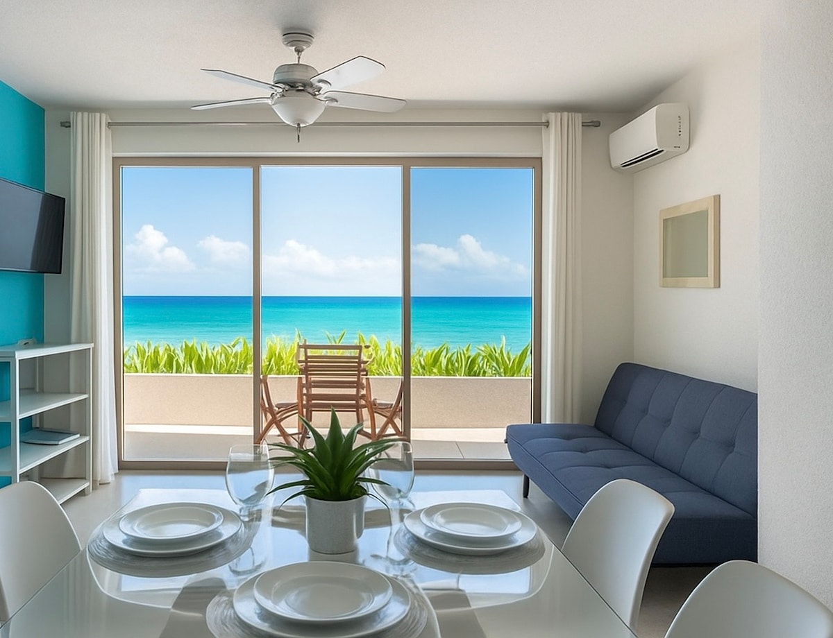 Stylish studio with amazing views, located in a 3 tower condo-hotel, pristine private beach, turquoise water, white sands. Huge wrap around balcony ocean and lagoon view. High speed Wifi, A/c, Smart Tv , safe. Lounge chairs and tents for free at pool and beach. Gym, tennis court, Coffee shop at lobby. Spa (with extra fee) Flexible All Inclusive Option for food and drinks -Pay only for the day(s) you want it-. Decide as your vacation unfolds.(today $95 usd p/p per day) ideal for couples