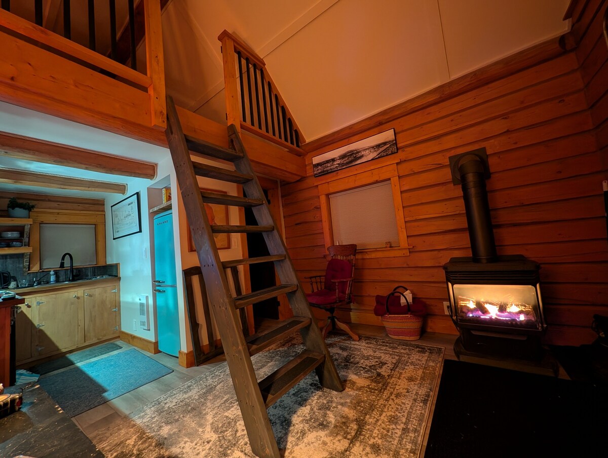 Відпочиньте й розслабтеся в цьому стильному, спокійному помешканні. Розташований за 15 хвилин їзди від міста, люкс має 1 спальню та 1 ванну кімнату, побудований у 2023 році.У спальні є ліжко-чердак над ліжком queen-size. Ділянка площею 3,7 акра виходить на безкрайні зелені простори та стежки.Люкс містить верхню терасу площею 400 кв. футів, з якої відкривається прекрасний вид на гори, і яка може бути чудовою для перегляду північного сяйва. На терасі є меблі для патіо та пропановий камін. Поруч із апартаментами розташований дерев 'яний будинок, у якому проживають власники помешкань.