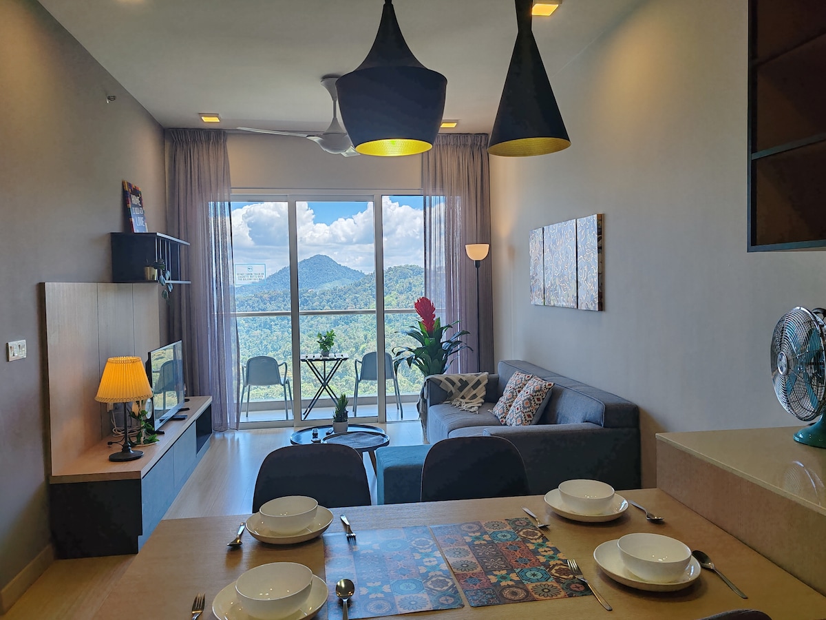 Enjoy breathtaking mountain and cloud views from your private suite at Antara Genting. Right above Antara Mall with link-bridge access to SkyAvenue. This modern 1BR suite fits 2–4 guests and features a TV box, bathtub with bathboom & bubble booster, hot & cold water dispenser, and full kitchenette. Enjoy more than 50 facilities suitable for family trip in this serviced apartment.