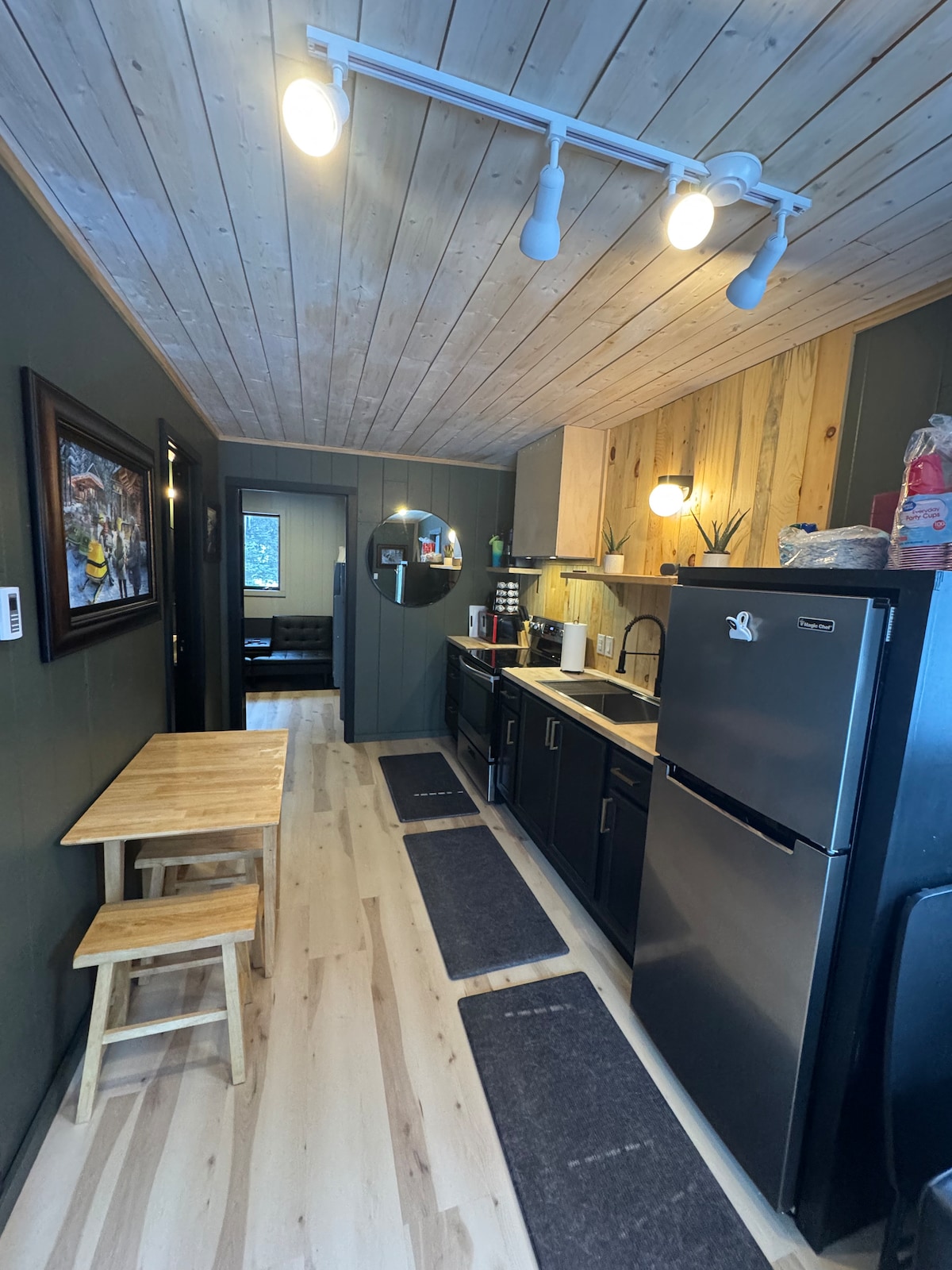 Повний кондомініум з одним ліжком queen-size у спальні та диваном у вітальні. Можна комфортно спати 4. Ви також маєте доступ до повноцінної кухні. Насолоджуйтеся гірськолижним курортом Snow River та снігохідними трасами всього в двох метрах від помешкання взимку або прогуляйтеся по горах з дикобразою та іншими заходами на свіжому повітрі влітку! Наразі ми люб 'язно просимо домашніх тварин.