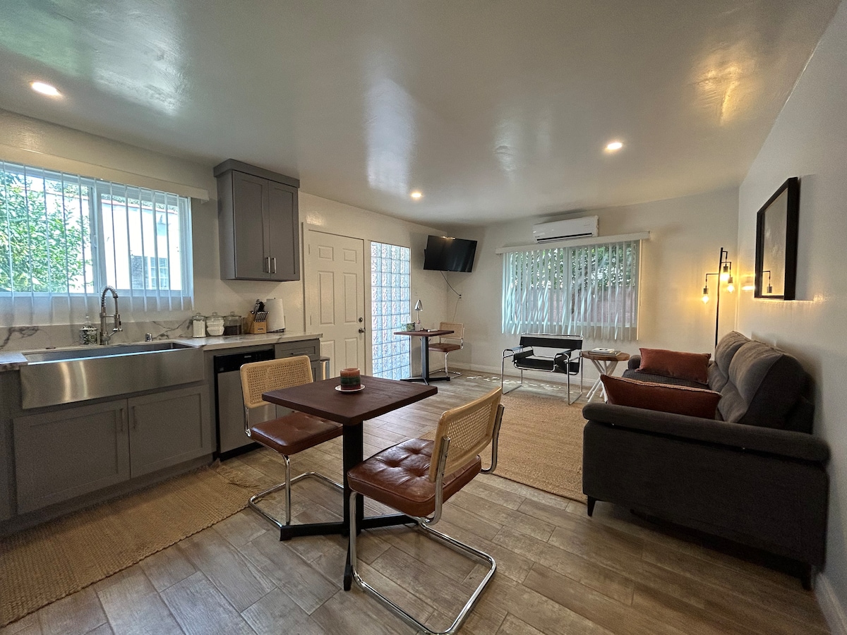 Unwind in style in this bright, comfortable West Hollywood guest suite. Relax outside near the rose garden or inside in the Old Hollywood-inspired bathroom. Plum and gray hues mix throughout to create a truly modern oasis. This 1 bedroom-1 bathroom Craftsman guest suite is centrally located in one of the safest and most pedestrian-friendly neighborhoods of LA. First class amenities in this professionally decorated unit include granite counters, hardwood floors, and stainless steel appliances.