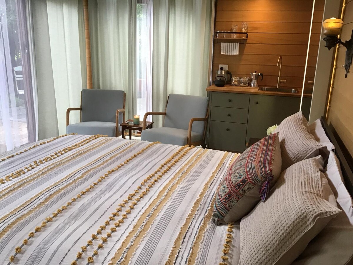 Це стильне місце для розміщення ідеально підходить для відпочинку та людей, які проїжджають повз, яким потрібна ніч, щоб розірвати подорож. У номері є міні-кухня, обладнана керамічною варильною поверхнею з 1 конфоркою, конвекційною мікрохвильовою піччю, тостером, чайником і кавоваркою/співом молока та кубиком льоду. Надається також безкоштовний чай і кава. Шампунь/кондиціонер, мило та рушники також включені. Кавовий столик також перетворюється на стіл для обіду. Інструкції містяться в вітальному пакеті.