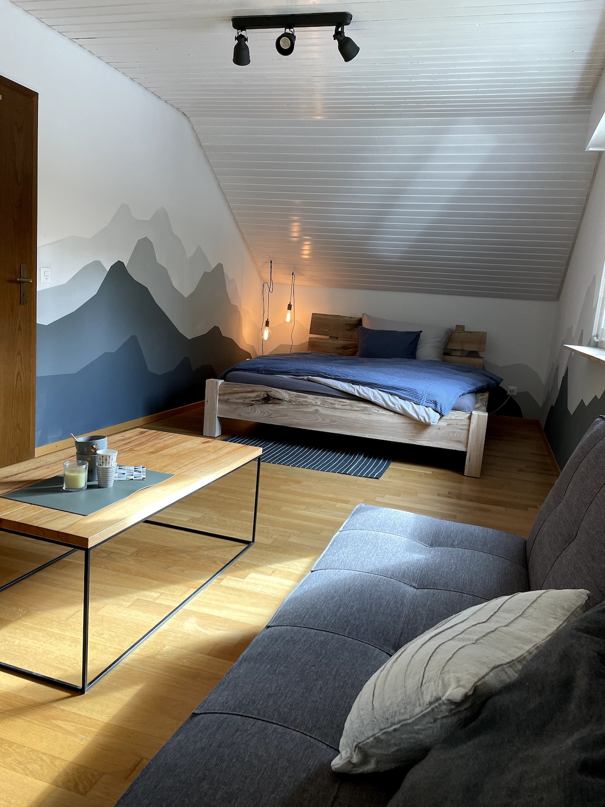 Ми орендуємо дуже гарну, недавно мебльовану та затишну квартиру площею 30 кв. м з окремою спальнею. У відкритій вітальні з кухнею та їдальнею є великий диван-ліжко. Квартира має окремий вхід до квартири і знаходиться на першому поверсі (без сходинок), безкоштовна парковка знаходиться поруч із квартирою. Квартира знаходиться посеред селища, її легко знайти. Всього в трьох хвилинах від автобусної зупинки, в 40 хвилинах від Цюріха. Ми, приймаюча сім 'я, живемо на верхньому поверсі.