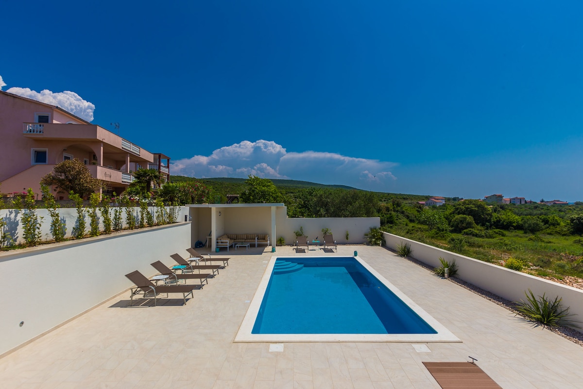Apartment in Villa Ria with pool is a new and modern luxury apartment with a sea view that makes you feel like home. Modern and functional apartment, designed for relaxation and comfortable stay. Accommodation unit size is 45m2 + 15m2 (with terrace) with separate bedroom, fully equipped kitchen, bathroom, large living/dining room, satellite TV, free wifi, a/c and parking. Outdoor swimming pool is in a garden area with a sea view. The beach and restaurant are 250m distance.