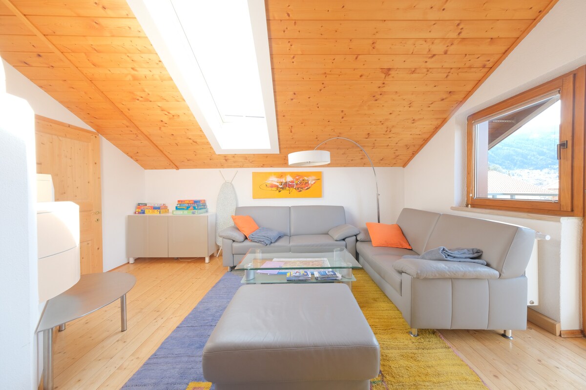 Затишок, простора легкість атмосфери, тиха, розслаблююча обстановка серед вражаючого саду, приголомшливі панорамні краєвиди, а також творчість та оригінальність характеризують це помешкання. Мансарда площею 45 м², що є частиною двоповерхової квартири, - це ідеальний відпочинок після насиченого дня в горах, на гірськолижних схилах або після перебування в привабливих пабах і культурних майданчиках альпійського міста Інсбрук.