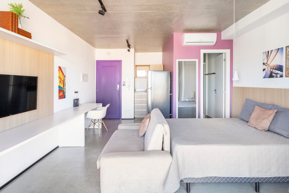 Практична студія, комфортна та стильна. Розташоване в центрі Сан-Паулу, в оточенні відзначених нагородами ресторанів і великим варіантом транспорту. Тут є все необхідне для короткого або тривалого перебування. З неймовірним краєвидом на місто та захід сонця є кондиціонер із доглядом іонів, смарт-телевізор, мікрохвильова піч, дуплексний холодильник, плита та звукова коробка. Безпечна та закрита парковка всередині будівлі, басейну та фітнес-центру.