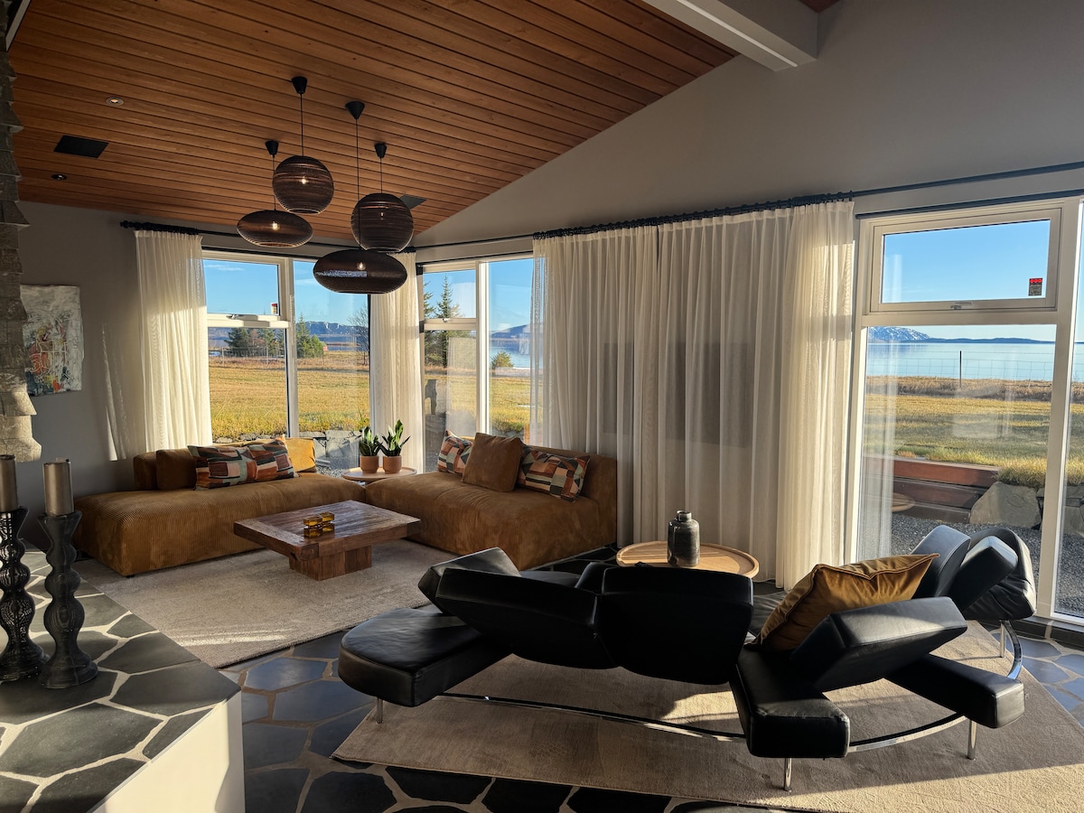 Відпочиньте на приголомшливому помешканні на березі озера з 3 спальнями у Вейділундурі, Південна Ісландія, всього в 9 км від національного парку Тингвеллір. Сучасні зручності, гідромасажна ванна, сауна та величезна веранда пропонують розкішні помешкання з захоплюючими краєвидами.