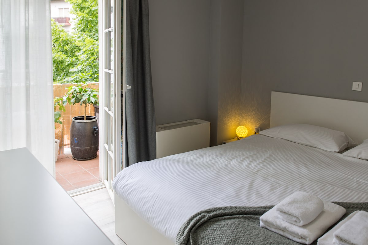 Наша квартира з 2 спальнями, 1 ванною кімнатою, кухнею, просторою вітальнею з диваном та обіднім столом, кондиціонером та просторим патіо розташована всього в 100 метрах від озера Блед (зона для плавання). Він розташований у дуже спокійному районі. Вона має власний вхід і розташована в нашому будинку (тому ми завжди поруч, щоб допомогти). Ми - сім 'я з 5 осіб і будемо раді прийняти вас. Екологічна відповідальність: ми виробляємо більше енергії, ніж використовуємо. Туристичний збір (3,13 для дорослих на день, 1,56 для дітей старше 7 років) не включений.